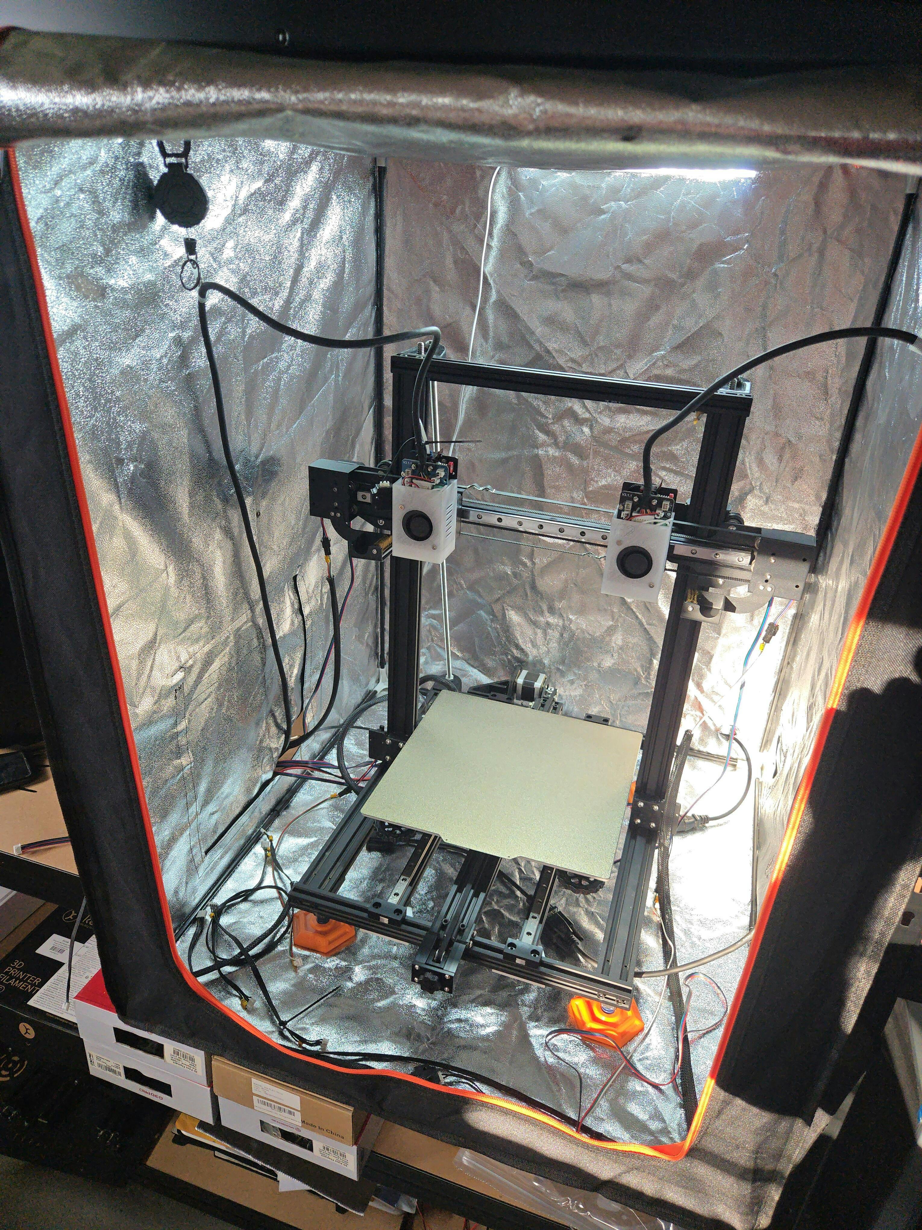 For the future, I would like to be able to see better from the front how the printer is printing. The tip of the nozzle, that is. But that only affects the housing, I'll try to design something a little different for myself. What I think would be very good is if the E2 extruder could be fixed so that it cannot be adjusted in Z. But that's just a wish, there's nothing to complain about, it's a very well thought-out system